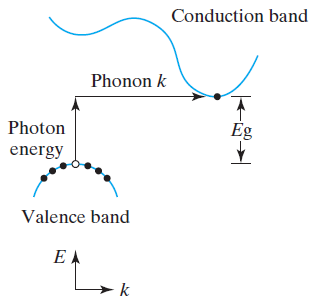 indirect gap semiconductor : Si. 밴드갭 가장자리의 전자와 정공의 파동 벡터(k)가 다른 경우