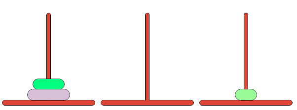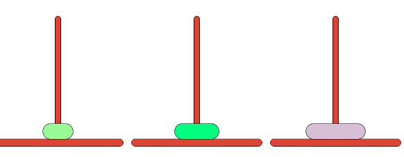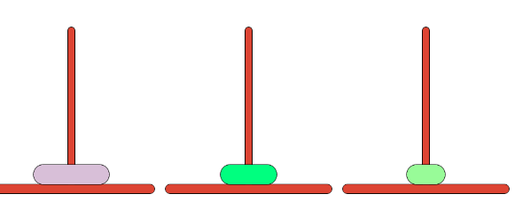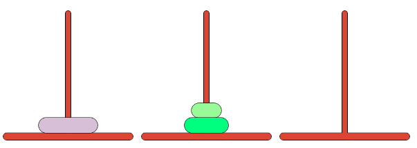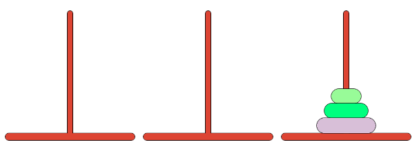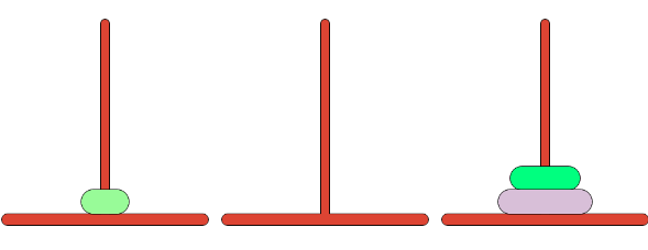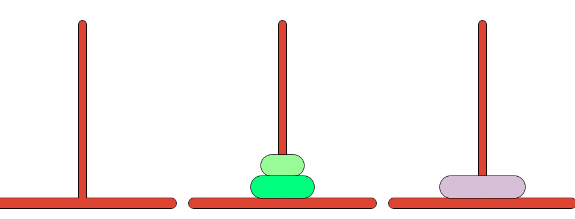 세 개의 장대가 있고 첫 번째 장대에는 반경이 서로 다른 n개의 원판이 쌓여 있다. 각 원판은 반경이 큰 순서대로 쌓여있다. 이제 수도승들이 다음 규칙에 따라 첫 번째 장대에서 세 번째 장대로