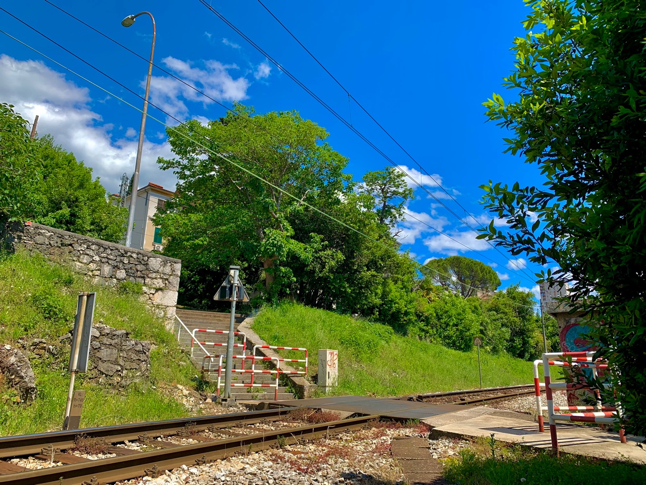 이 철길을 건너야 계단을 오를 수 있다.